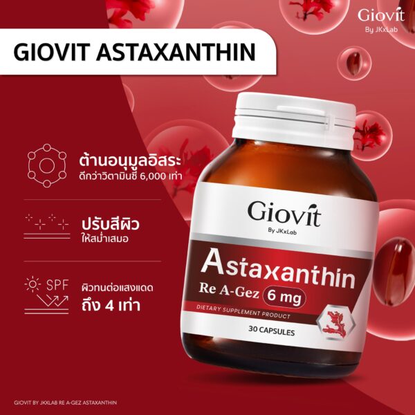 ByadminJune 22, 2025รู้จักกับ Astaxanthin – สารต้านอนุมูลอิสระอันทรงพลัง Astaxanthin (แอสตาแซนธิน) คือสารต้านอนุมูลอิสระจากธรรมชาติในกลุ่มแคโรทีนอยด์ ซึ่งมีประสิทธิภาพสูงกว่าวิตามิน C, E และ CoQ10 หลายเท่า ช่วยชะลอความเสื่อมของเซลล์ ต่อต้านการอักเสบ และเสริมสร้างภูมิคุ้มกัน Giovit Astaxanthin คืออะไร? Giovit Astaxanthin เป็นผลิตภัณฑ์เสริมอาหารที่อุดมไปด้วยแอสตาแซนธินคุณภาพสูง สกัดจากสาหร่ายฮีมาโตคอกคัส...