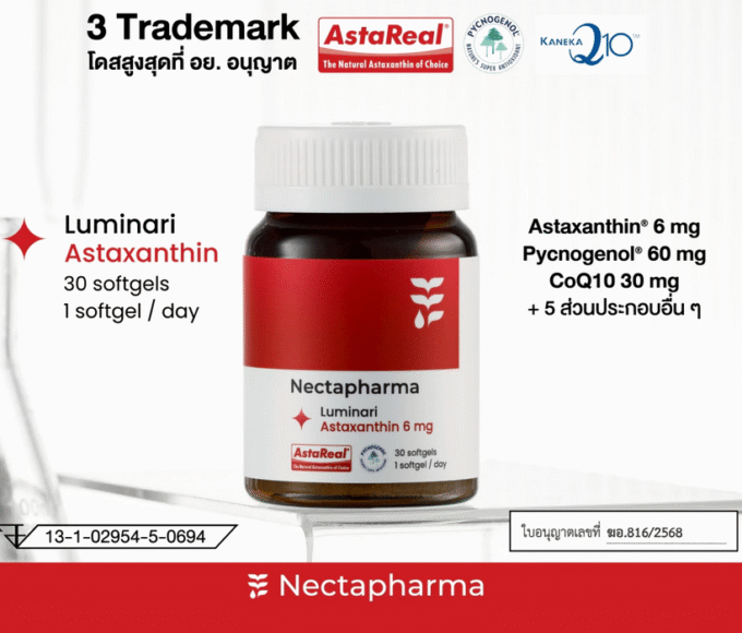 ByadminAugust 28, 2025จุดเด่นส่วนผสม (มีงานวิจัยรองรับ) 🌿 Astaxanthin ธรรมชาติ AstaReal® 6mg✔ มีงานวิจัยสนับสนุนกว่า 150 ฉบับ (70 ฉบับในคน) ยืนยันผลลัพธ์และความปลอดภัย 🌿 French Maritime Pine Bark (Pycnogenol®) 60mg✔ มีงานวิจัยกว่า 450 ฉบับ...