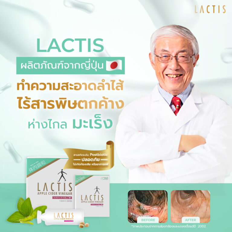 Lactis ผลิตภัณฑ์จากประเทศญี่ปุ่น ผลิตจาก Apple Cider ซึ่งเป็นวัตถุดิบธรรมชาติ ด้วยจุลินทรีย์ ถึง 16สายพันธุ์ หมักบ่ม 1 ปีเต็ม จึงนำมาสกัดอีกขั้น ช่วยทำความสะอาดลำไส้ ต้นตอของโรคหลายๆโรค ไร้สารพิษตกค้าง ห่างไกลจากมะเร็ง สารสกัดระดับ Postbiotic ปลอดภัย ไม่เกิดท้องเสีย ไม่ปวดบิด ท้องร่วง หรือการแพ้