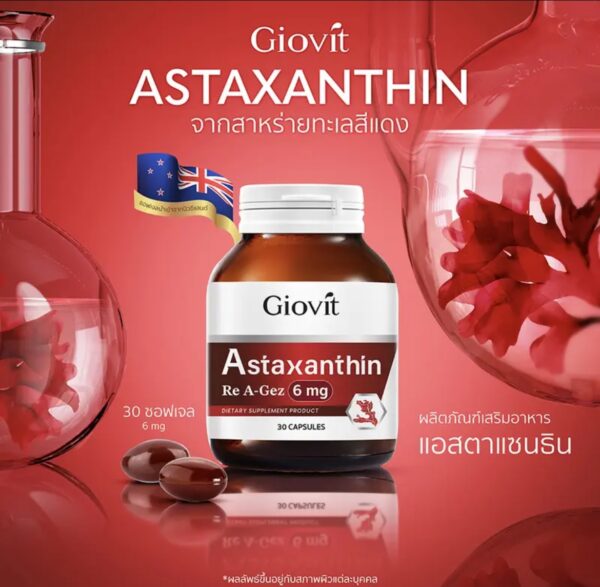 ประโยชน์ของ แอสตาแซนติน Giovit Astaxanthin 1. สำหรับผิว : ลดเลือนริ้วรอย สร้างความชุ่มชื้นให้กับผิว ช่วยให้สุขภาพผิวที่ดีขึ้น สารสีแดงแห่งความเยาว์วัย แอสตาแซนติน ถือเป็นราชาแห่งสารต้านอนุมูลอิสระ วิตามินช่วยเรื่องผิว มากกว่าวิตามินอื่นๆหลายเท่าตัว มากกว่า วิตามิน C ถึง 6,000 เท่า มากกว่า วิตามิน...